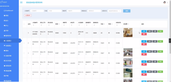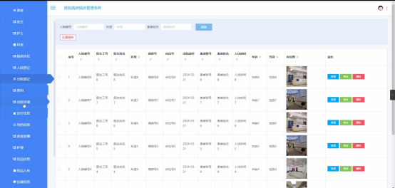 入院登记功能在视图层(view层)进行交互,比如点击“搜索或批量删除”按钮或填写入院登记信息表单。这些入院登记表单动作被视图层捕获并作为请求发送给相应的控制器层(controller层)。控制器接收到这些请求后,调用服务层(service层)以执行相关的业务逻辑,例如验证输入数据的有效性和与数据库的交互。服务层处理完这些逻辑后,进一步与数据访问对象层(DAO层)交互,后者负责具体的数据操作如查看、修改、收费、出院或删除入院登记信息,并将操作结果返回给控制器。最终,控制器根据这些结果更新视图层,以便入院登记功能可以看到最新的信息或相应的操作反馈。入院登记界面如图5-11所示: