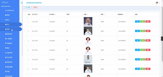 护士管理:工号、姓名、科室、电话、头像,责任床位自动绑定。