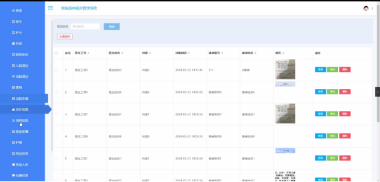 诊疗信息功能在视图层(view层)进行交互,比如点击“搜索、批量删除”按钮或填写诊疗信息表单。这些诊疗信息表单动作被视图层捕获并作为请求发送给相应的控制器层(controller层)。控制器接收到这些请求后,调用服务层(service层)以执行相关的业务逻辑,例如验证输入数据的有效性和与数据库的交互。服务层处理完这些逻辑后,进一步与数据访问对象层(DAO层)交互,后者负责具体的数据操作如查看、修改或删除诊疗信息,并将操作结果返回给控制器。最终,控制器根据这些结果更新视图层,以便诊疗信息功能可以看到最新的信息或相应的操作反馈。诊疗信息界面如图5-14所示: