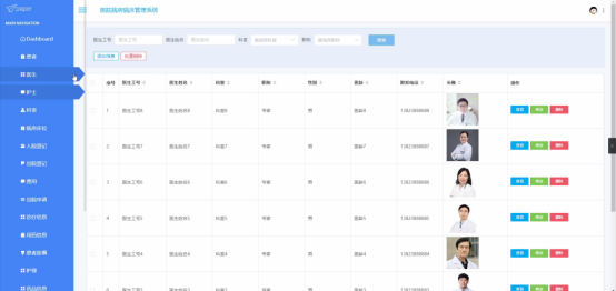 医生管理:工号、姓名、科室、职称、医龄、电话、头像,排班与权限联动。