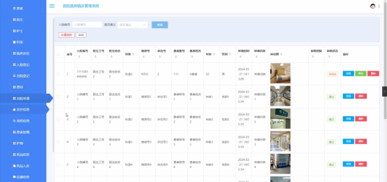出院申请功能在视图层(view层)进行交互,比如点击“搜索、批量删除或审核”按钮或填写出院申请信息表单。这些出院申请表单动作被视图层捕获并作为请求发送给相应的控制器层(controller层)。控制器接收到这些请求后,调用服务层(service层)以执行相关的业务逻辑,例如验证输入数据的有效性和与数据库的交互。服务层处理完这些逻辑后,进一步与数据访问对象层(DAO层)交互,后者负责具体的数据操作如查看、修改或删除出院申请信息,并将操作结果返回给控制器。最终,控制器根据这些结果更新视图层,以便出院申请功能可以看到最新的信息或相应的操作反馈。出院申请界面如图5-13所示: