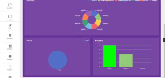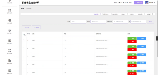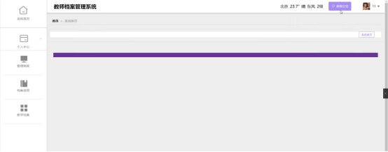管理员进入主页面,主要功能包括对系统首页、个人中心、教师、档案类型、管理制度、档案信息、档案调入、档案调出、教学档案、弹窗提醒、系统公告等进行操作。管理员主页面如图5-3所示:
