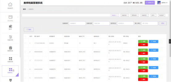 档案调入:在档案调入页面输入档案编号、档案名称、教师姓名和调入单位进行查询或删除档案调入列表,并根据需要对档案调入详细信息进行查看、修改或删除等操作;如图5-7所示: