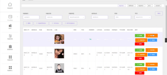 档案信息:在档案信息页面输入档案编号、档案名称、教师姓名、职称,选择学历和档案类型进行查询或删除档案信息列表,查看档案类型统计、学历统计、教学经验统计等,并根据需要对档案详细信息进行查看、档案调入、档案调出、修改或删除等操作;如图5-6所示: