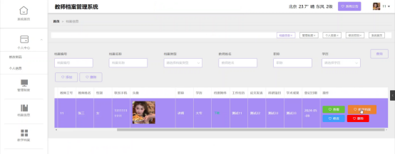 档案信息:在档案信息页面输入档案编号、档案名称、教师姓名、职称,选择学历和档案类型进行查询、添加或删除档案信息列表,并根据需要对档案详细信息进行查看、教学档案、修改或删除等操作;如图5-12所示: