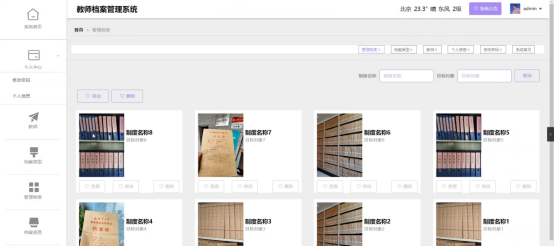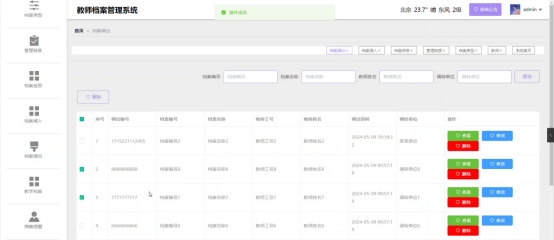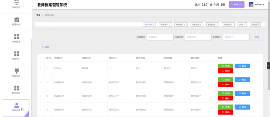 教学档案:在教学档案页面输入档案编号、档案名称和教师姓名进行查询或删除教学档案列表,并根据需要对教学档案详细信息进行查看、修改或删除等操作;如图5-9所示: