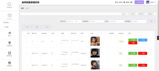 所有功能模块均提供“增删改查、批量导入导出、关键字检索、分页排序、统计图表、操作日志”七件套,不留死角;档案调入、调出与教学评估额外附带流程状态与审批链路,保证每一次变动都有迹可循。整套系统把教师从填表、跑腿、对账中解放出来,让管理者在秒级统计里洞察师资结构,真正让数据成为教育治理的新基建。