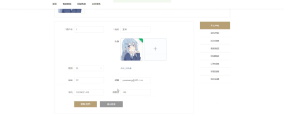 个人中心:在个人中心页面可以对个人中心、修改密码、扣分信息、售卖物品、同城售卖、订单信息、举报信息、我的收藏进行详细操作;个人中心页面如图5-4所示: