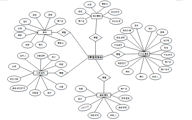 在一个资料模式中,一个被称作“实例”的实体,与真实的“事件”或者“物体”相匹配,可以与其它物体区分开来。例如,公司中的每个员工,家里中的每个家具。在系统中将对“用户、公告资讯、订单信息、扣分信息、举报信息”等几个主要的实体属性进行布局,如图4-2所示: