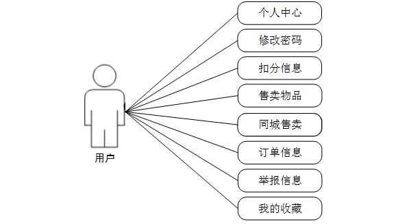 (2)、用户关键功能包含个人中心、修改密码、扣分信息、售卖物品、同城售卖、订单信息、举报信息、我的收藏等进行管理。用户用例如下: