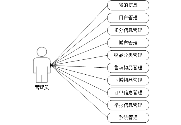管理员关键功能包含我的信息、用户管理、扣分信息管理、城市管理、物品分类管理、售卖物品管理、同城物品管理、订单信息管理、举报信息管理、系统管理等进行管理。管理员用例如下: