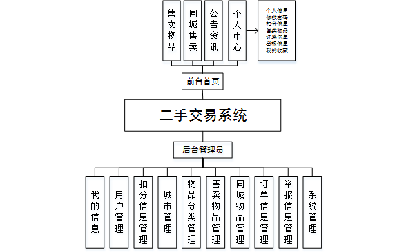 本论文中实现的二手交易系统将以用户核心的日常信息维护工作为主,主要涵盖了我的信息、用户管理、扣分信息管理、城市管理、物品分类管理、售卖物品管理、同城物品管理、订单信息管理、举报信息管理、系统管理等功能,采用该二手交易系统将满足用户日常管理工作的基本需求。本系统与用户操作的全过程相契合,从用户登录开始录入系统,然后记录二手交易管理信息,从而让用户对系统的管理都能够清晰规范,相应信息的检索和维护简单高效,进而提高用户整体工作的效率。