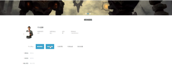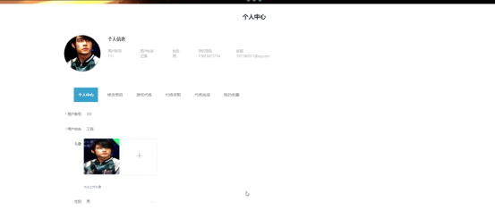 用户个人中心:在个人中心页面输入个人信息可以进行更新操作,并在个人中心、修改密码、游戏代练、代练领取、代练完成、我的收藏页面进行详细操作;如图5-6所示:
