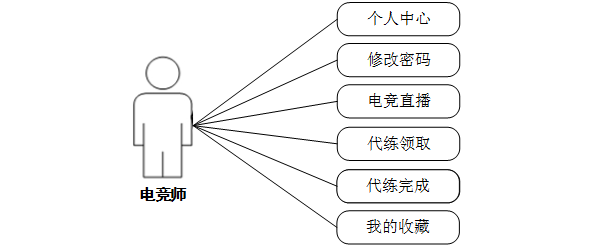 (4)电竞师可以实现对个人中心、修改密码、电竞直播、代练领取、代练完成、我的收藏等信息进行操作,用例分析如图3-4所示。