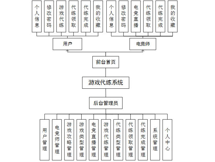 综合游戏代练系统管理经历和对网上信息归纳整理的结果,在实际应用中,将用户分为三种:管理员,用户和电竞师三个角色。其中用户可以操作的内容是有限的,管理员可以进行的操作最多。了解系统用户的分类以及可以进行的操作,对于接下来实现相关的功能具有重要的意义。
