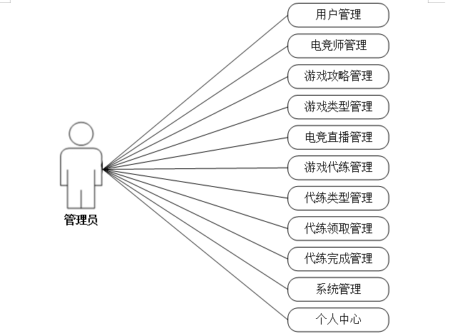 (2)管理员可以对用户管理、电竞师管理、游戏攻略管理、游戏类型管理、电竞直播管理、游戏代练管理、代练类型管理、代练领取管理、代练完成管理、系统管理、个人中心等进行基本的信息管理。其用例分析如图3-2所示。