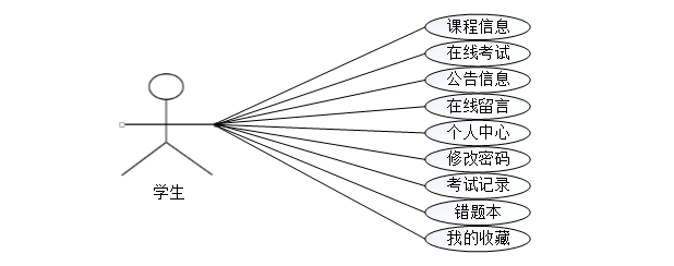 (1)、学生关键功能包含课程信息、在线考试、公告信息、在线留言、个人中心、修改密码、考试记录、错题本、我的收藏等进行操作管理。学生用例如下: