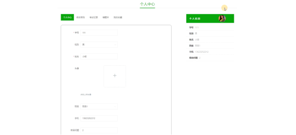 个人中心:在个人中心页面可以对个人中心、修改密码、考试记录、错题本、我的收藏等功能进行操作;如图5-5所示: