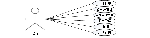 (3)、教师关键功能包含课程信息、题目库管理、在线考试管理、题目管理、考试管理、我的信息等进行操作管理。教师用例如下: