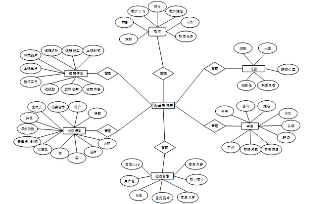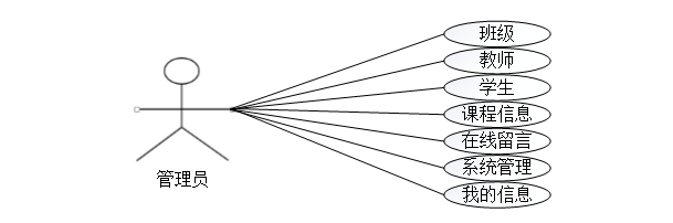 (2)、管理员的功能是最高的,可以对系统所在功能进行查看,修改和删除,包括班级、教师、学生、课程信息、在线留言、系统管理、我的信息功能。管理员用例如下: