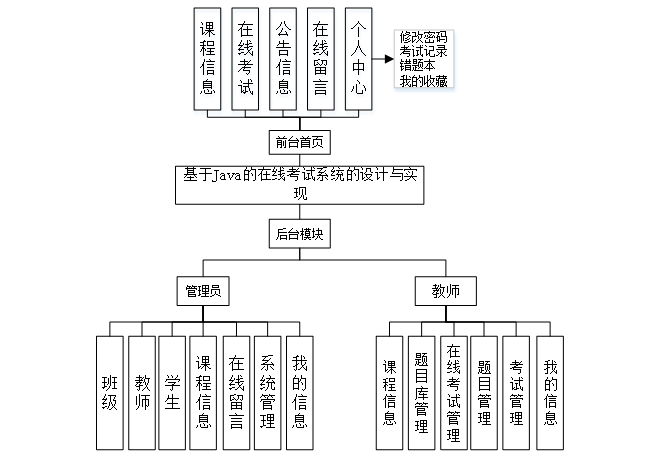 基于Java的在线考试系统的设计与实现按照权限的类型进行划分,分为学生、教师和管理员三个模块。学生模块主要实现个人中心、修改密码、我的收藏等操作,增强了用户的操作体验。管理员模块主要针对整个系统的管理进行设计,提高了管理的效率和标准。系统的总体模块设计如下图所示: