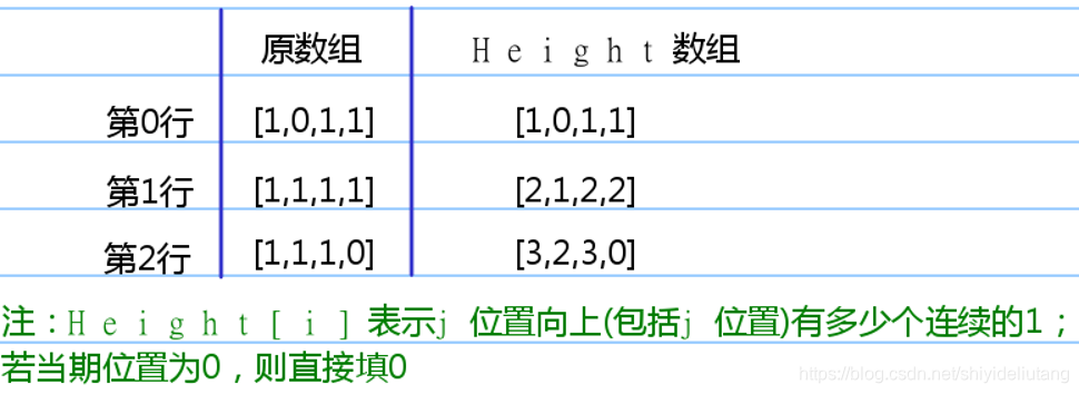 (1)首先对原数组做初步处理:以每一行为切割,统计当前行作为底的情况下,每个位置向上1的数量,使用高度数组Height来表示。