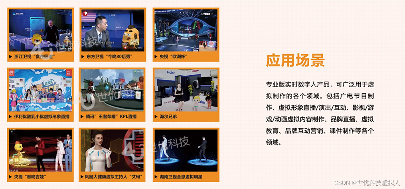世优科技已经与众多品牌携手打造了多场成功的虚拟直播、虚拟发布会、广电节目制作、虚拟演唱会、短视频录制等,助力品牌解锁线上活动流量密码。同时先后与央视打造“阿央”虚拟IP、同时合作打造了百度希加加、虚拟歌手小缪、“京东狗”、“海尔兄弟”等虚拟形象,累计打造“复活”500+虚拟形象IP,致力打造数字人工厂。
