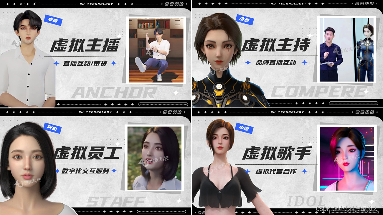 世优科技作为国内较早的虚拟人技术服务商,提供“虚拟人建模设计+动作捕捉驱动+虚拟人直播互动”一站式全栈技术方案。结合客户诉求提供个性化虚拟数字人定制,包括超写实虚拟人、二次元虚拟形象、3D卡通吉祥物“复活”等,可以用于虚拟偶像、虚拟主播、虚拟代言、虚拟主持…目前累计打造“复活”700+虚拟形象IP,致力打造数字人工厂。