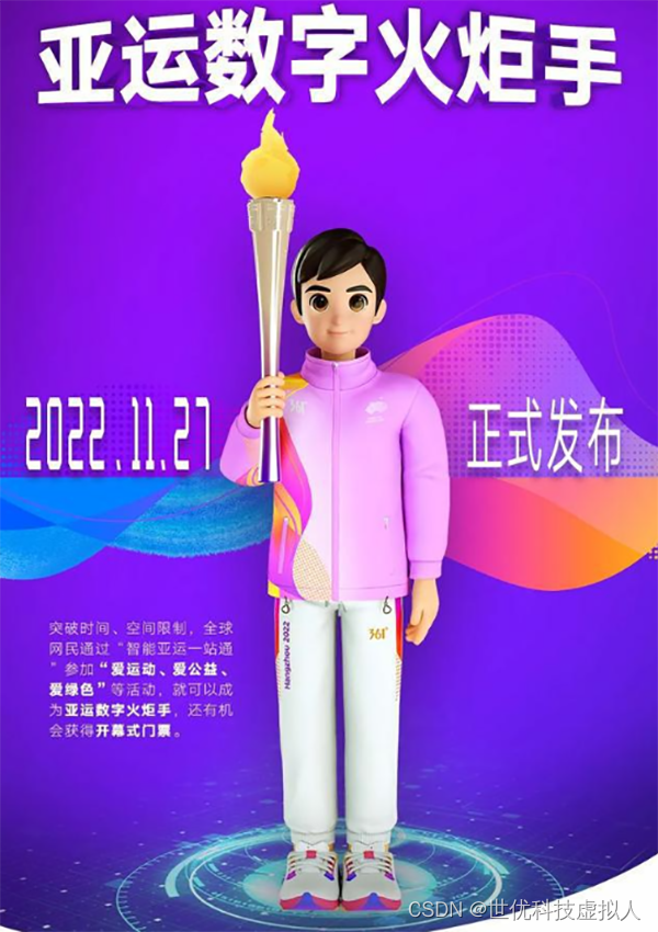 4、杭州2022年亚运会倒计时300天+主题活动在杭州举行。活动现场,杭州亚组委发布亚运数字人平台,向全球首创性推出“亚运数字火炬手”。据悉,亚运数字火炬手将现实世界的“亚运火炬手”拓展至数字世界,让更多的人能够突破时间、空间限制直接参与到亚运会这一盛大体育文化活动中。#数字人火炬手##虚拟形象#