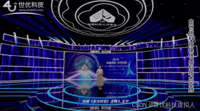 虚拟演播室技术在线上直播的应用已成必然趋势,以世优科技提供虚拟演播室技术支持的项目为例,在全国科技工作者日主场活动直播中,就采用了世优科技虚拟演播室系统。世优科技利用了三维场景建模和实时抠像渲染技术,通过场景建模,材质贴图,灯光,阴影,粒子,动画等一系列技术,最大限度地还原了现实演播室的场景效果。在虚拟演播室顶部还可以看到为全国科技工作者日主场活动专属定制的元素,活动主题鲜明。