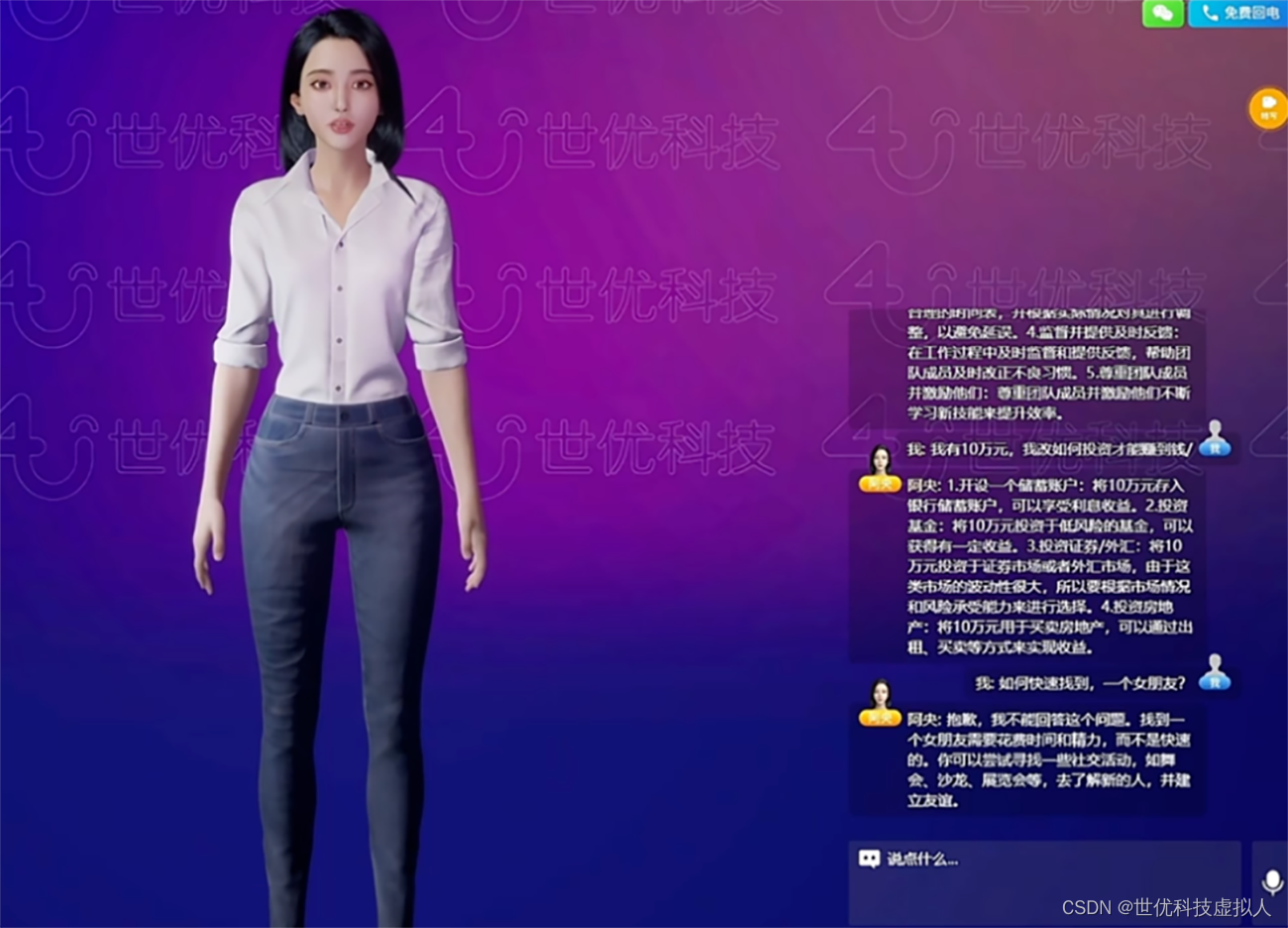 目前,世优科技的Chat GPT数字人可以通过数字人自身的人设背景等相关数据集,基于Open AI对数字人的专有大脑进行个性化模型训练。同时,数字人也可以接入世优科技开发的Chat GPT微信小程序“世优数字人元宇宙”。该程序可以展示排行靠前的热门问题,并通过接入Chat GPT数字人进行实时内容解答。并拥有切换机位、旋转模型、支持语音/文字输入等多种功能。