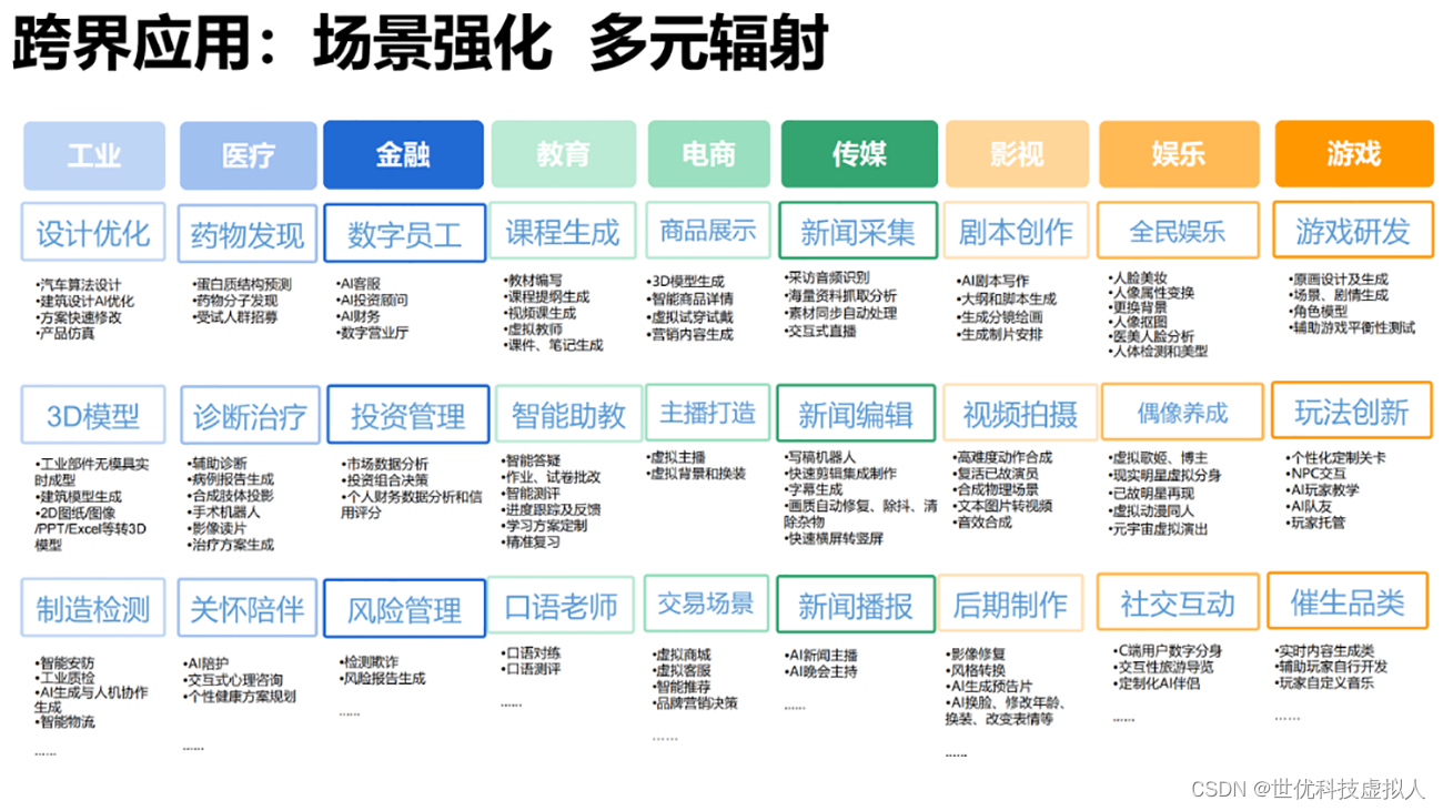 清华大学沈阳教授团队发布的《AIGC发展研究报告》揭示了AIGC在各行业的广泛应用,特别是在提升虚拟数字人的智能交互能力上。世优科技基于AIGC推出AI数字人产品“世优BOTA”,具备定制化、私有部署和持续进化等特性,优化了数字人的语言理解和交互性能,适用于多模态交互、内容生成和个性化营销等多种场景,推动了企业服务的智慧化升级。