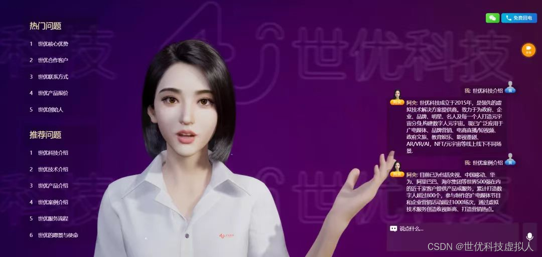 作为虚拟数字人技术服务商,世优科技基于自研的快速训练小模型能力,智能化深度学习、GPT多模态实时内容生成,与数字人形象结合,打造出新一代AI数字人产品“世优BOTA”,让AI从聊天窗口升级成人与“人”的直接交流,它专业、精准、成本低、懂业务、知企业、可无休,并具有专属定制、私有部署、反馈及时、形象焕新、永不掉线和持续进化六大产品亮点,有效提升了数字人智慧化服务垂直产业能力,从根本上释放生产力,助力企业进一步延展出更多的数字化发展可能性。