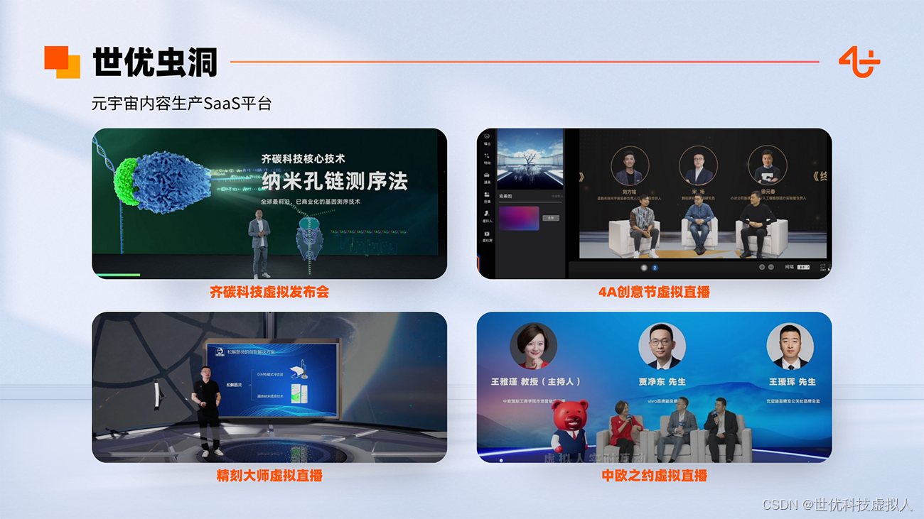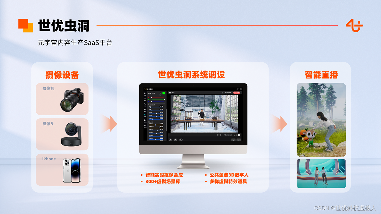 那么,数字化时代下,如何打造融媒体虚拟演播室?世优科技给出了答案。作为虚拟技术提供商,世优科技推出的3D数字虚拟内容SaaS平台—【世优虫洞】,具备许多亮点和优势,可以实现从直播前、中、后全流程精细化服务,能够全方位覆盖各种线上节目制作的需求。轻量化的操作系统,不仅可以运用到电视演播、影视制作、晚会综艺类视听节目生产、虚拟演唱会、电竞赛事上,还可以应用到企业产品发布、远程教育等众多领域,拥有非常广阔的应用前景,实现了一键打造高品质的虚拟直播场景。
