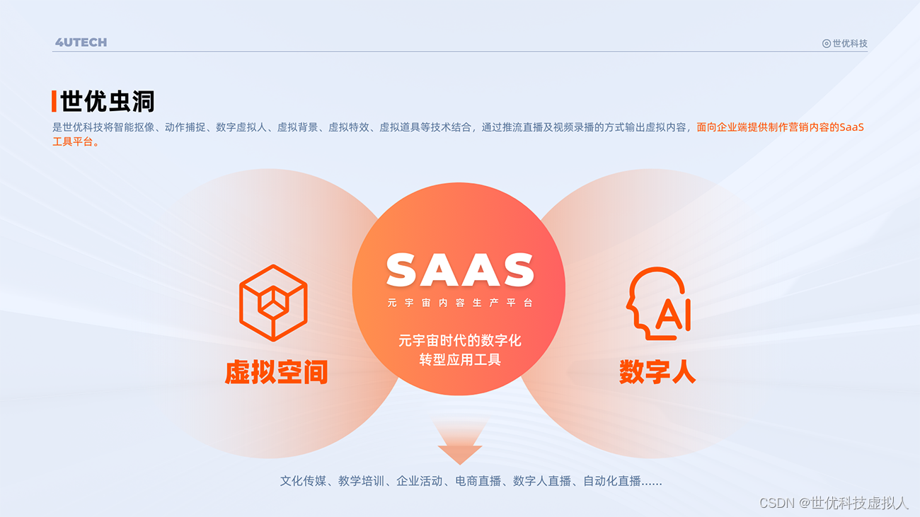 世优科技给出了答案。作为虚拟技术提供商,世优科技推出的3D数字虚拟内容SaaS平台—【世优虫洞】,具备许多亮点和优势,可以实现从直播前、中、后全流程精细化服务,能够全方位覆盖各种线上节目制作的需求。