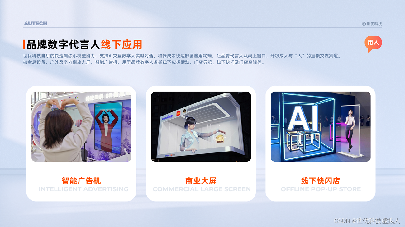 应用于线上,虚拟代言人可通过短视频、海报、直播等传播方式,成为品牌跨圈层传播的新渠道。应用于线下,虚拟代言人通过全息设备、户外及室内商业大屏、智能广告机,用于各类线下应援活动、门店导览、线下快闪及门店空降等。
