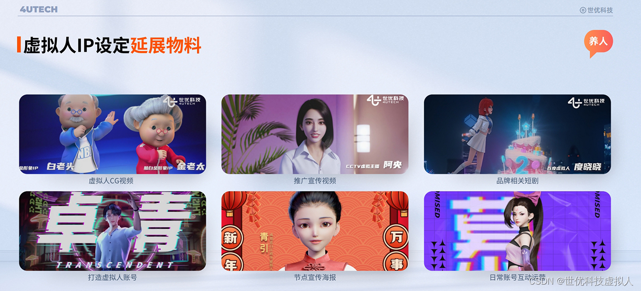目前,世优科技已为包括央视、中国移动、华为、阿里巴巴、海尔集团等世界500强在内的,近1000家客户提供产品或服务,累计打造数字人超过800个。合作案例包括虚拟数字人IP“阿央”、虚拟人“小观”、虚拟歌手“小缪”、虚拟主播“卓青”等形象;也有如“京东狗”、“海尔兄弟”、“白老头,金老太”、小米“小爱同学”等已经成为在消费者心里留下深刻印象的商业IP。
