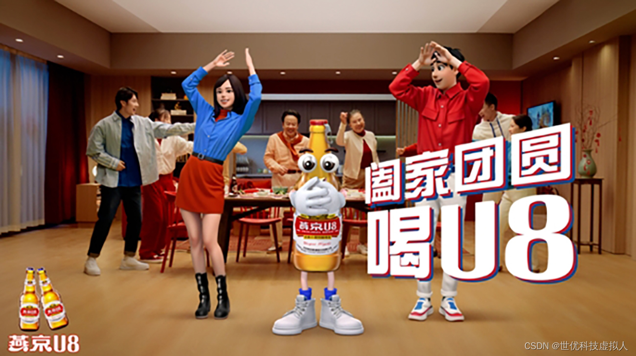 在2024年新春佳节即将来临之际,燕京啤酒再度打破传统,推出全新“虚拟人新春贺岁版”TVC,为消费者带来一场别开生面的视觉盛宴。以燕京U8酒瓶为主形象的动画小8,带着他的两个朋友——优优和JING,三个IP形象组成U8 family在燕京啤酒TVC中集体亮相,用魔性的音乐和舞蹈,瞬间吸引住了大家的眼球。通过营销创新和视觉技术的运用,燕京啤酒将新年文化、品牌理念与现代审美相结合,以虚拟人为核心元素,依托先进的制作技术,打造出极具视觉冲击力的画面效果。