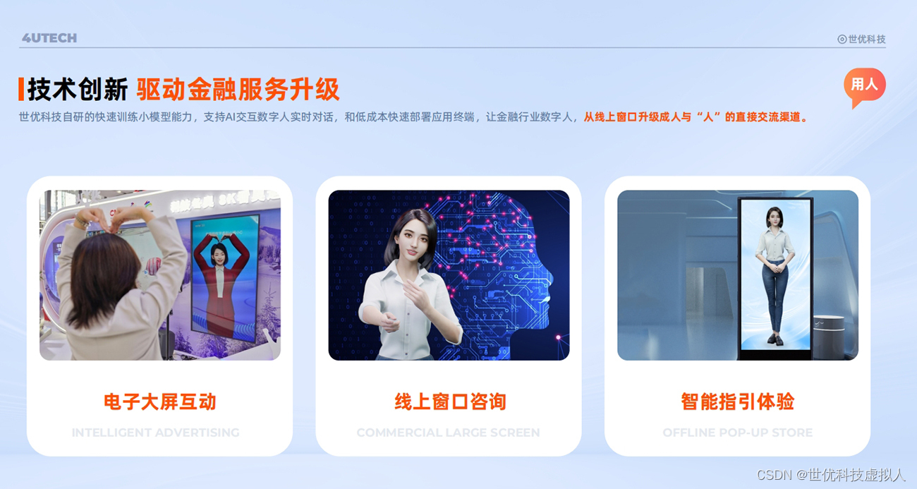 不难看出,依托数字人的能力,金融行业已经构建出营销和服务的新路径。作为虚拟数字人技术服务商,世优科技将数字人与AI技术融合,结合公司自研的快速训练小模型能力,运用语音识别、拾音感知、语音交互、人脸识别等技术,通过大屏交互一体机终端的形式,推出了“AI数字人交互一体机”定制解决方案。
