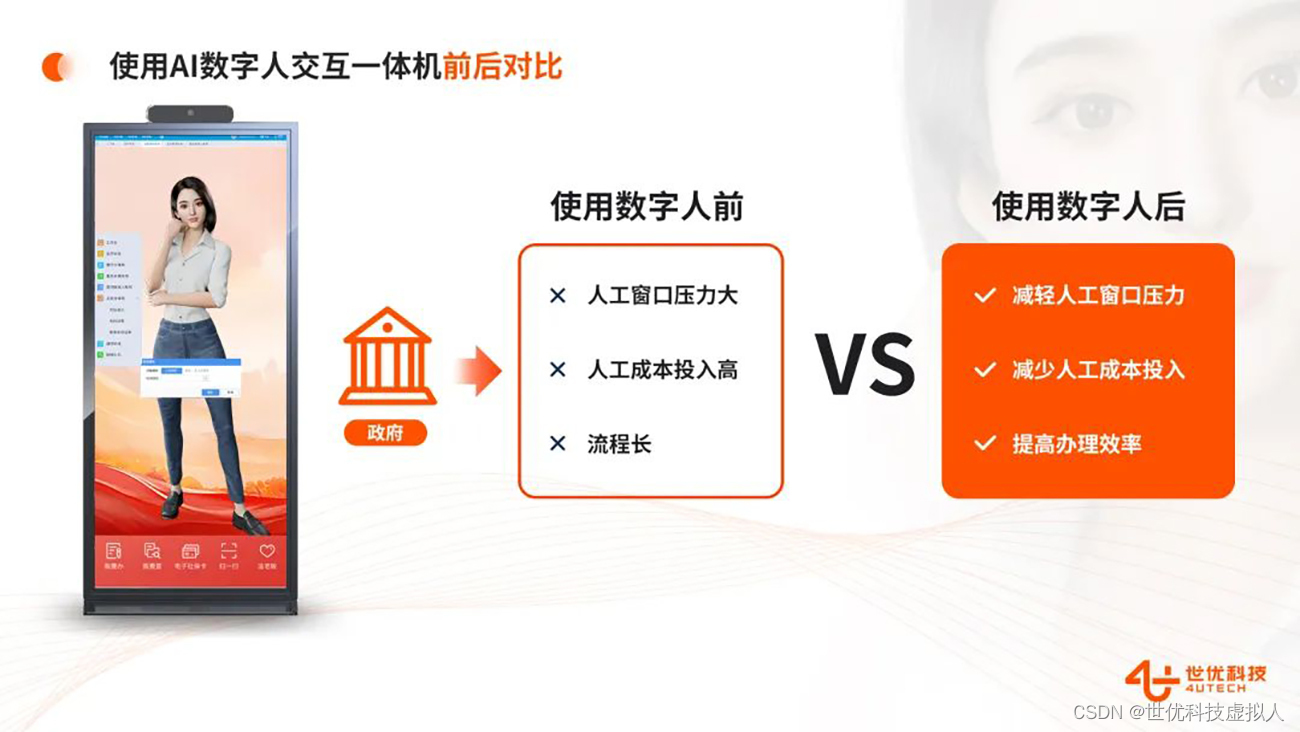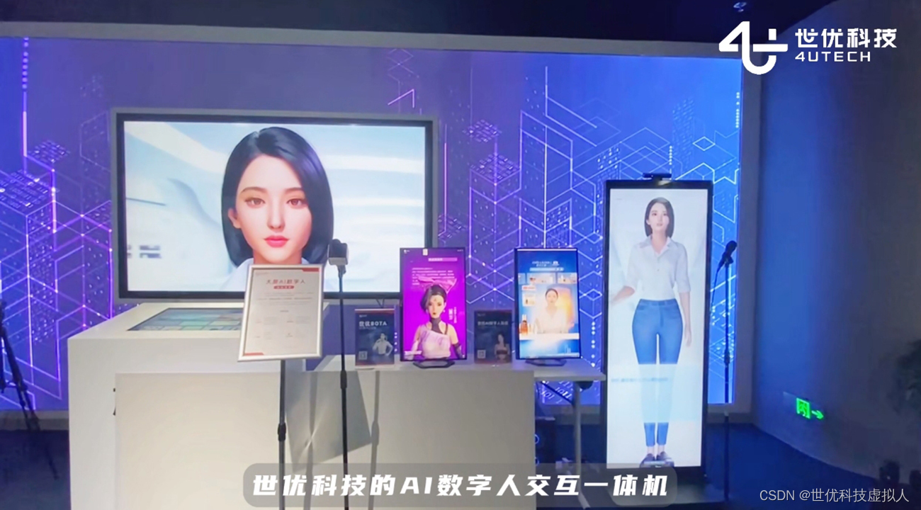 作为虚拟数字人技术提供商,世优科技基于自研的快速训练私有化模型能力,将AI技术、多模态感知交互、虚拟数字人等技术相融合,通过数字大屏、交互一体机、全息舱等终端的形式,推出了“政务+AI数字人”解决方案。
