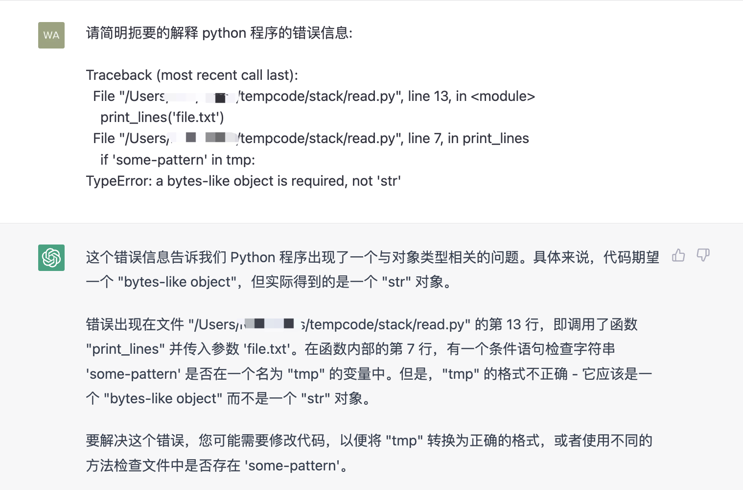 https://github.com/shobrook/stackexplain 项目,就是一个简化工具。项目逻辑非常简单,判断运行程序是什么语言,然后 prompt 中预先提示 ChatGPT,结果交由 ChatGPT 解释。对应的 prompt 如下: