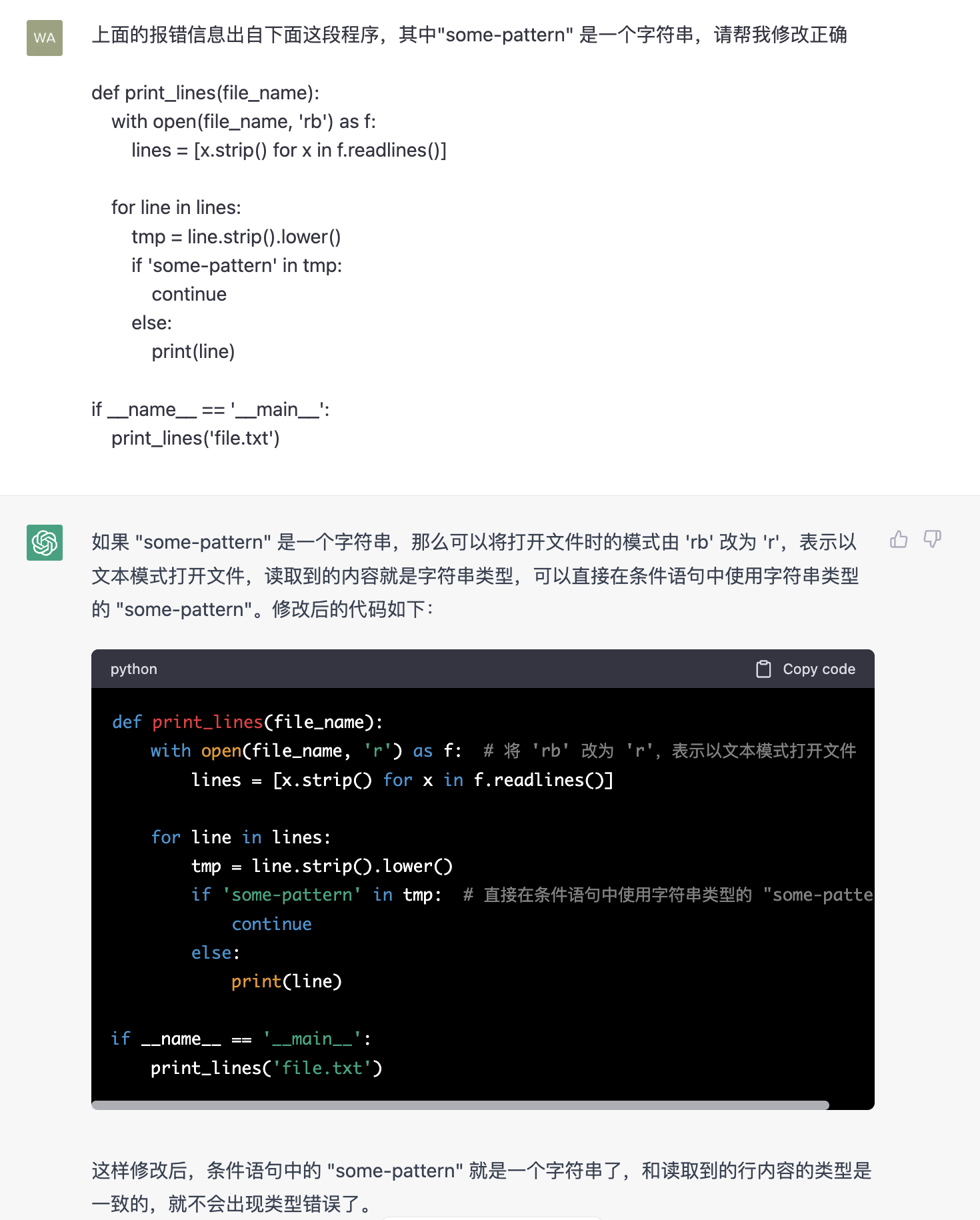 其中{language}是程序语言,{error_message}是报错信息。我们完全可以在 ChatGPT 的聊天界面上,使用这段 prompt 要求他帮助我们解释错误原因并给出解决方案,如下图所示: