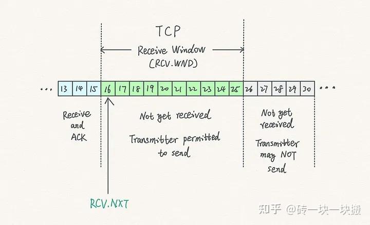 - 尚未接收但允许发送方发送的字节:这是接收方当前有能力接收的数据范围。