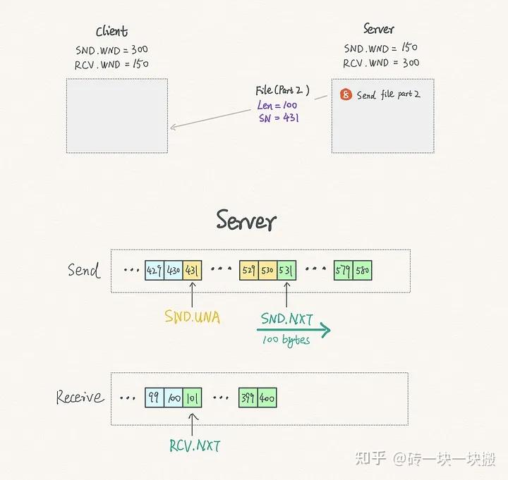 由于这部分数据已经发送但尚未被确认,服务器将 SND.NXT 向右滑动了 100 字节,从 431 移动到 531。