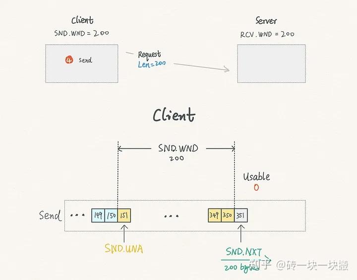 与此同时,之前发送的 150 字节数据已全部被确认,因此客户端的SND.UNA 向前滑动,此时可用窗口恢复为发送窗口的最大值,即 200 字节。