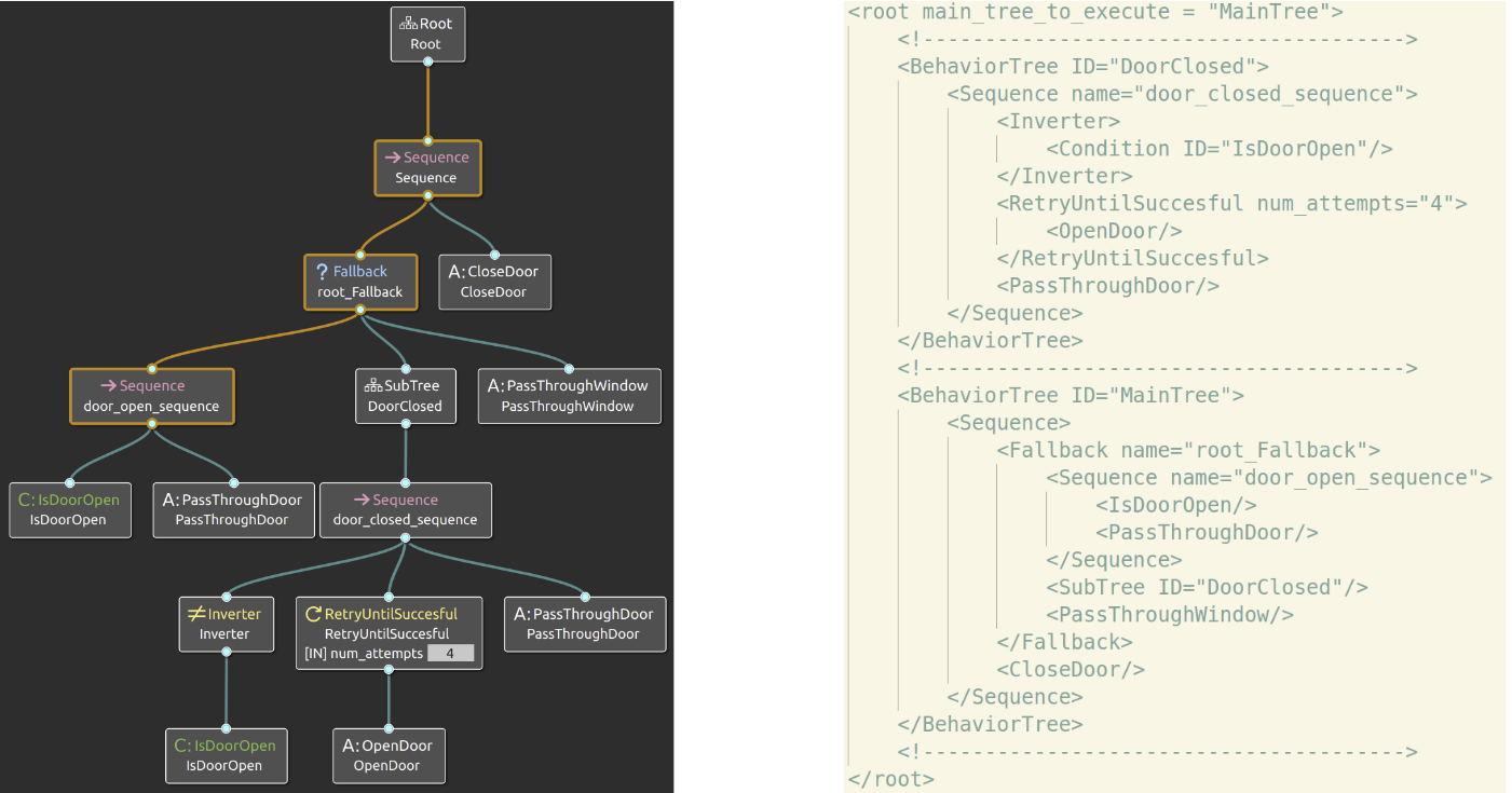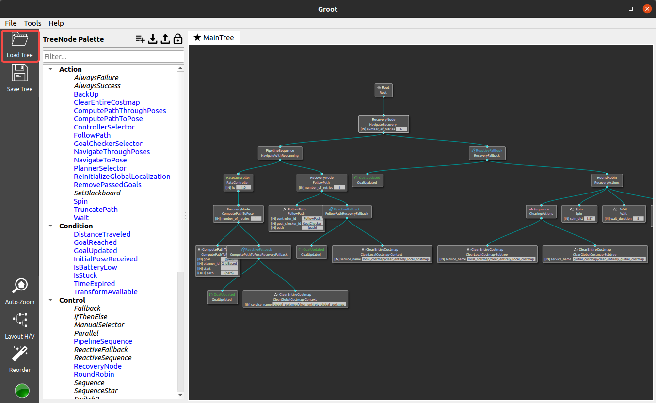 行为树是树状的结构,它的逻辑流程是由xml文件描述的。我们可以用其配套的工具Groot来可视化行为树。如下图所示: