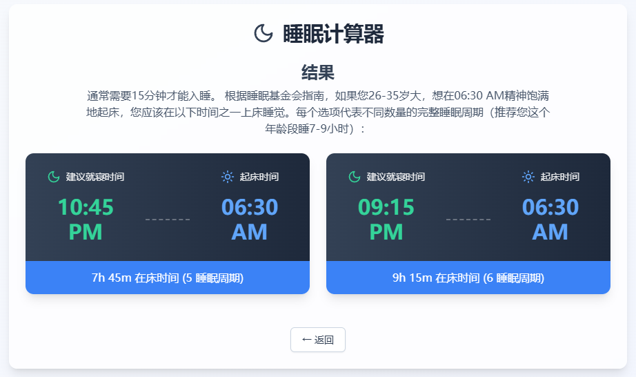 本睡眠计算器仅提供一般性的睡眠健康信息和建议,不能替代专业医疗诊断或治疗。如果您有持续的睡眠问题、睡眠障碍或其他健康担忧,请及时咨询医生或睡眠专家。