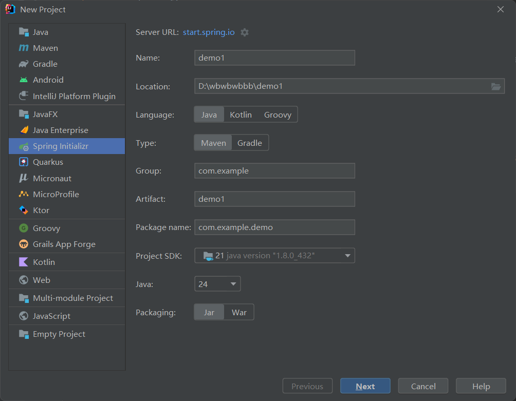 其中语言为Java,如出现Java版本在创建项目中未找到,可以后续再IDEA内进行修改,所以只需要随便选一个即可,如这里我们想要使用Java1.8版本,但是IDEA默认的官方创建网址不支持,我们先随意选择一个版本,然后点击next: