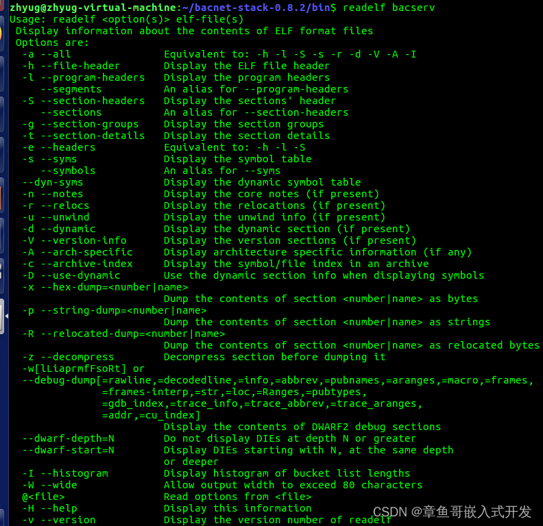 readelf命令 用来显示一个或者多个elf格式的目标文件的信息,可以通过它的选项来控制显示哪些信息。这里的elf-file(s)就表示那些被检查的文件。可以支持32位,64位的elf格式文件,也支持包含elf文件的文档(这里一般指的是使用ar命令将一些elf文件打包之后生成的例如lib*.a之类的“静态库”文件)。