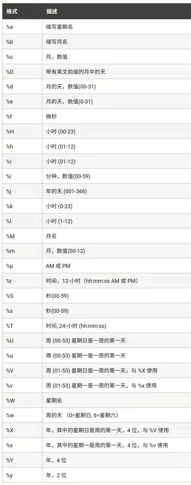 - 例如:date_formate('2021-06-01','%m/%d/%Y')返回数据06/01/2021